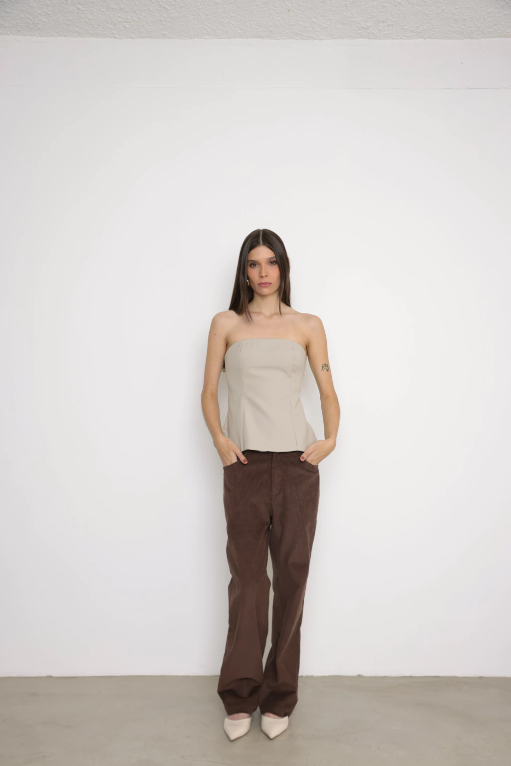 Blusa sem alças com fechamento por zíper invisível na parte de trás.
