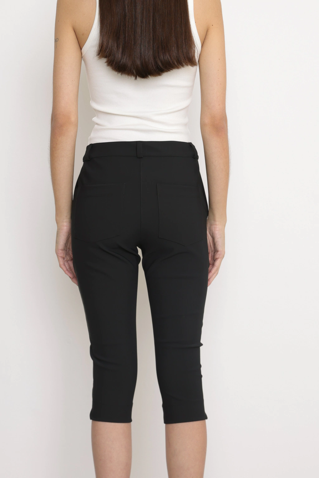 Calça corsário confeccionada em malha estruturada com bolsos laterais e traseiros e fecho por zíper e botão frontal.