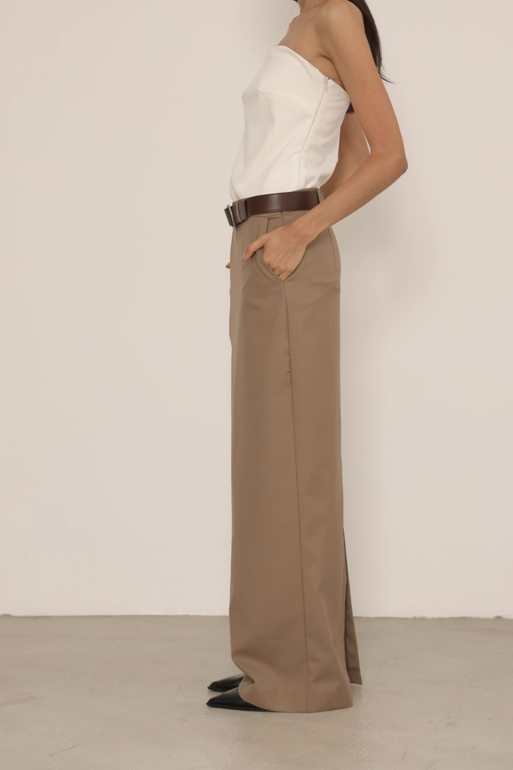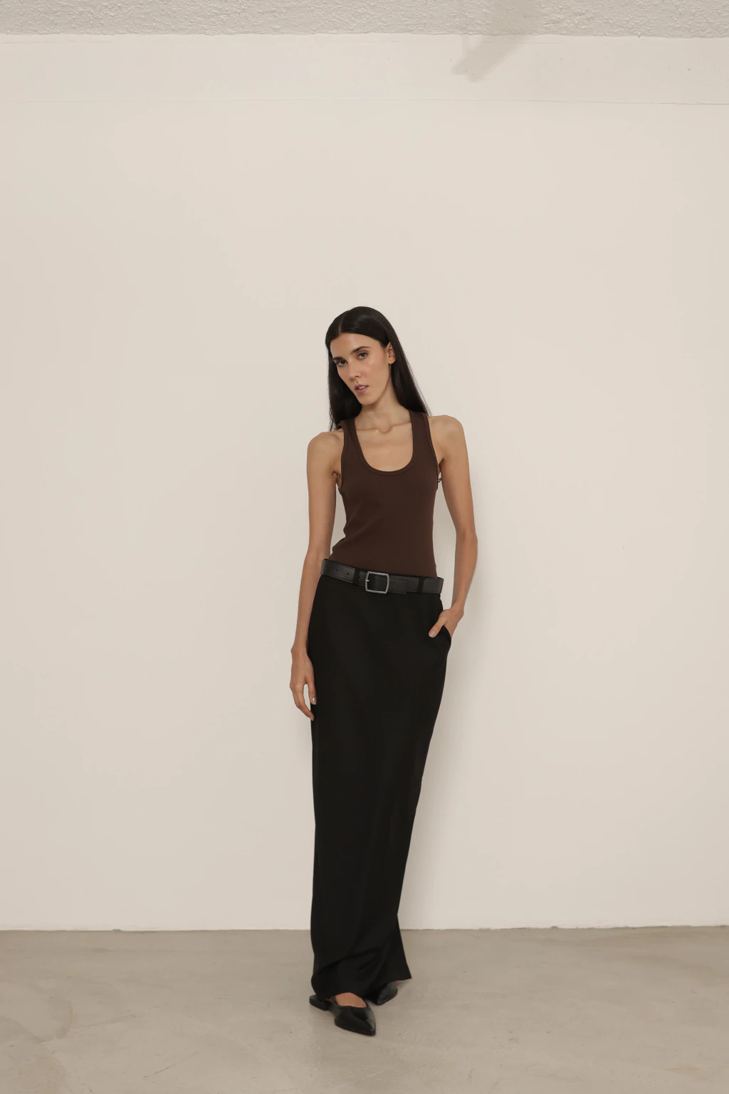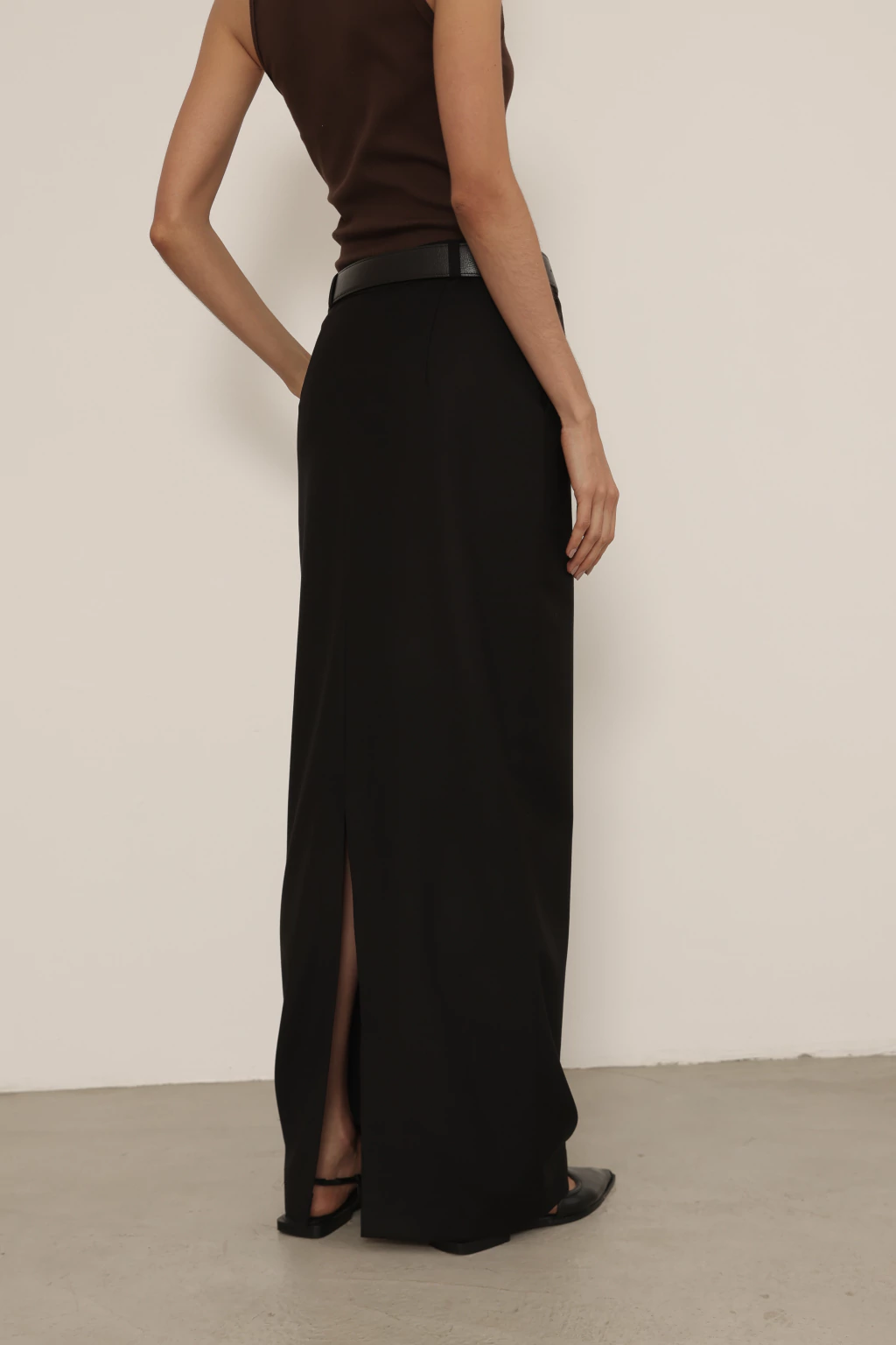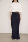 Saia longa de alfaiataria com fenda na parte de trás. Possui fechamento por zíper lateral, bolsos e passantes.